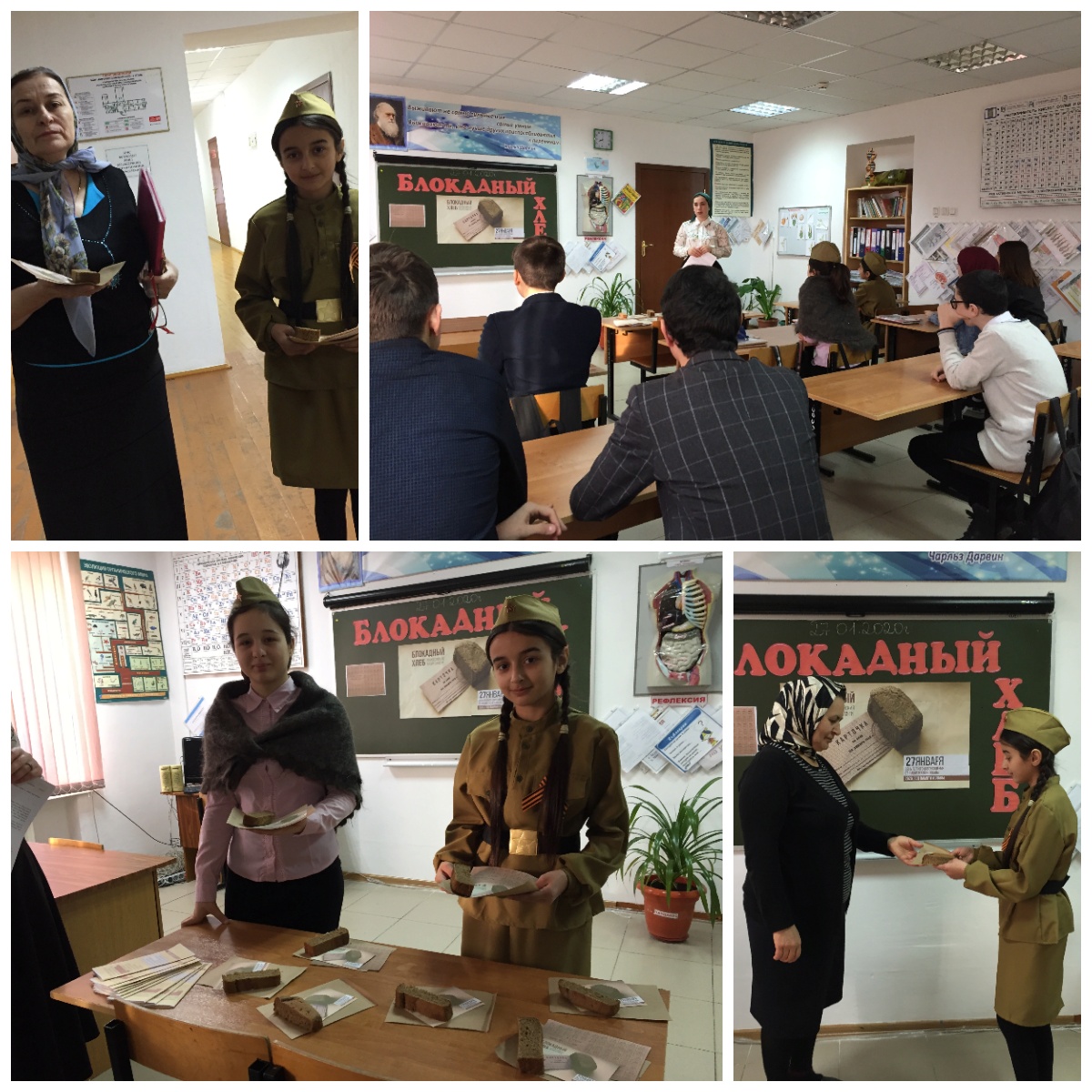 27.01.2020г. учителем истории Шапиевой О.М. проведен Урок памяти «Блокадный хлеб». Урок начался со стихотворения О.Берггольц «Блокадный хлеб». Блокада Ленинграда длилась 872 дня. Это число знакомо нам из учебников, но для тех, кто жил в этом городе – это не просто цифра: каждый из этих дней оставлял тяжелый след в жизни каждого блокадника. Ленинград терял своих жителей с колоссальной скоростью. По разным подсчетам, в городе погибло от 692 000 до 1 500 000 человек – и почти все из них умерли от голода. Единственной надеждой на завтрашний день был паек. Буханка хлеба постепенно превратилась в 125-ти граммовый кусочек – именно такая минимальная норма выдачи хлеба была установлена для жителей блокадного Ленинграда. Для того чтобы дети воочию увидели норму суточного хлебного пайка, приготовили кусочки хлеба в 125 грамм, которые помещались на ладони. Учитель истории Шапиева О.М. рассказала о составе блокадного хлеба, призвала учащихся бережно относиться к хлебу.