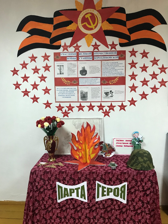 участниками отряда «Юнармия» были собрана и изучена информация о ветеранах ВОВ, которые жили в станице Бороздиновская. После приведённых поисковых мероприятий учащиеся школы оформили патриотическую «Парту героя», на которой размещена информация о героях, вошедших в историю Отечества с их фотографиями, биографиями, героическим путем.