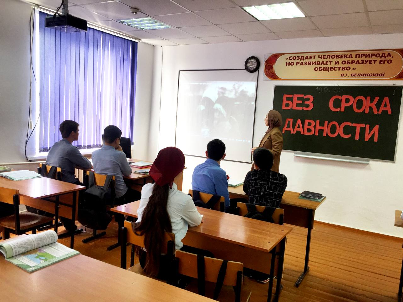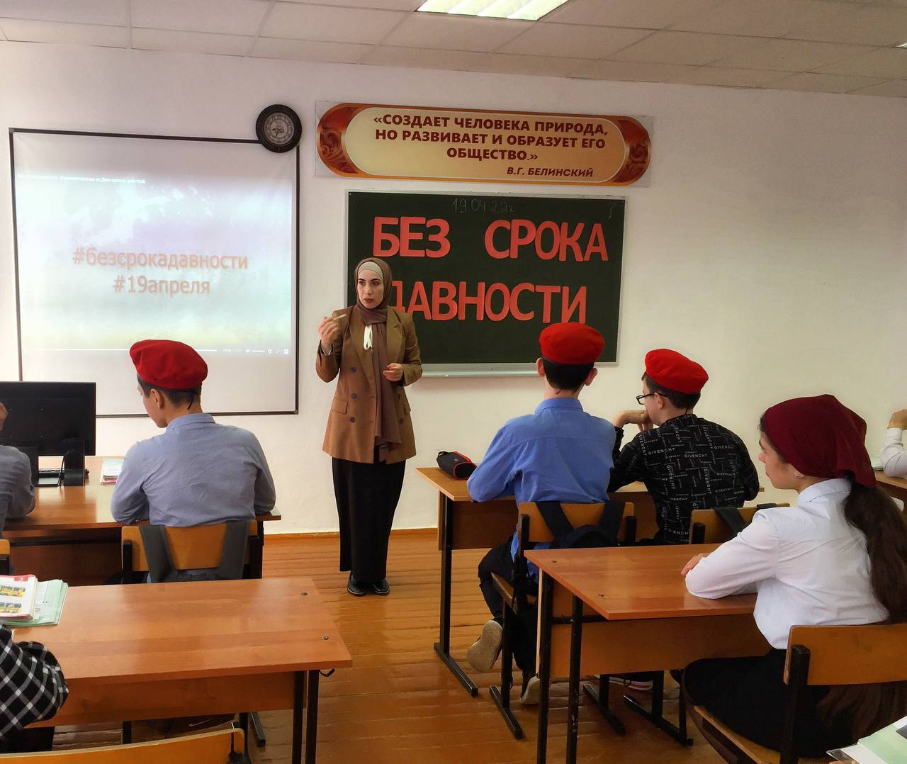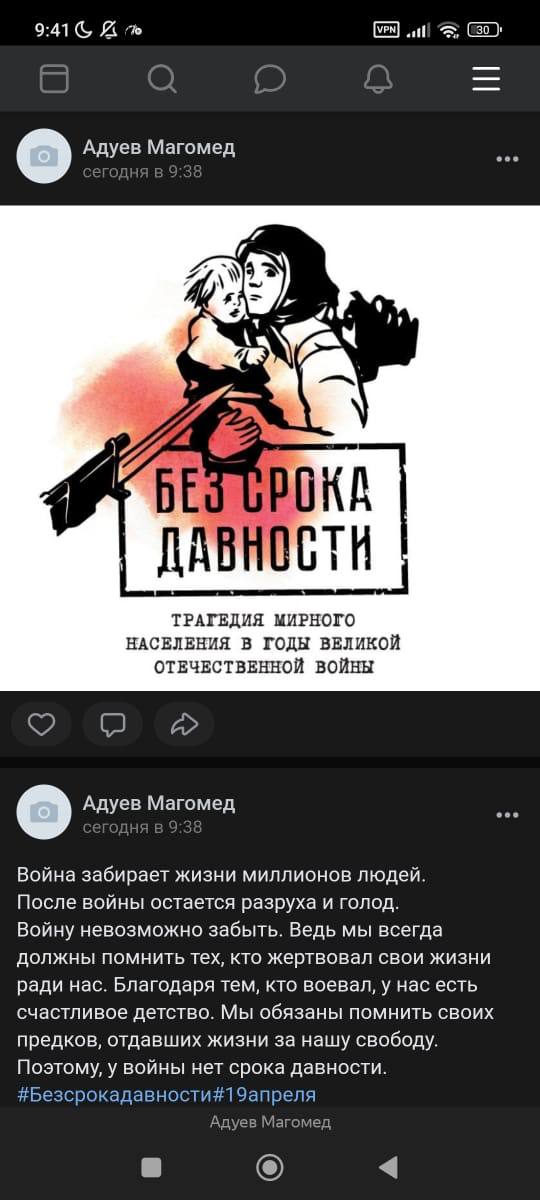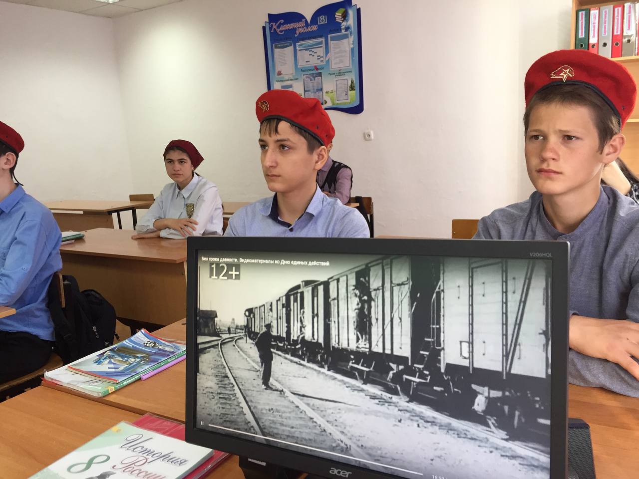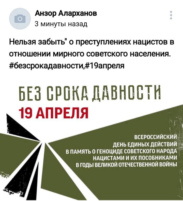 Целью Единого урока стало сохранение исторической правды о преступлениях нацистов и их пособников в отношении мирных советских граждан в годы Великой Отечественной войны. Учитель истории Шапиева Оксана Муртазалиевна рассказала об истории возникновения этого Дня памяти, о тяжёлых годах ВОВ, о создании в годы войны тысяч концлагерей, о тех людях, которые погибли там, о зверствах фашистов. В рамках Всероссийского проекта "Без срока давности" дети посмотрели видеофильм "Без срока давности". По итогам урока обучающиеся и члены детско-юношеского военно-патриотического общественного движения «Юнармия» поделились своей позицией в социальных сетях о преступлениях нацистов в отношении мирного советского народа. Все желающие могут присоединиться к событию! - Разместите в социальных сетях пост с заголовком «Нельзя забыть». Выразите свою позицию о преступлениях нацистов в отношении мирного советского населения. - Укажите хэштеги #безсрокадавности #19апреля