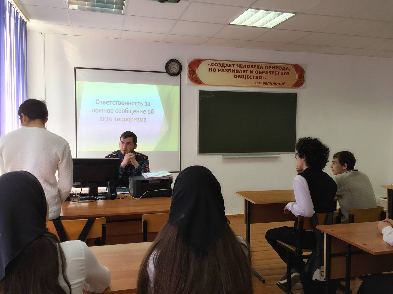 22.04.2022Во исполнение пункта 3.5 Плана основных организационных мероприятий МВД России на 2022 год, а также в соответствии с требованием распоряжения МВД России от 21 февраля 2022 года №1/1701 «О проведении оперативно-профилактического мероприятия «Твой выбор» в период с 14 по 22 апреля проведено оперативно-профилактическое мероприятие «Твой выбор» по профилактике безнадзорности и правонарушений несовершеннолетних. В рамках оперативно-профилактического мероприятия «Твой выбор» инспектором ПДН ОМВД России по Шелковскому району ст.лейтенантом полиции Абдурахмановым Х.А. проведена беседа с обучающимися 9-11 классов МБОУ «Бороздиновская СОШ» «Ответственность за ложное сообщение об акте терроризма». Он предупредил учащихся об уголовной ответственности за пропаганду идей террористического или экстремистского характера, а также за осуществление деятельности направленной на разжигание межрелигиозной ненависти и розни, совершение иных противозаконных действий, направленных на поддержание терроризма и экстремизма. Обратил внимание присутствующих и на недопустимость совершения ложных вызовов о готовящемся акте терроризма, поскольку за такие шутки статьей 207 Уголовного кодекса предусмотрена уголовная ответственность в виде максимального наказания - лишения свободы на срок до трех лет. В ходе беседы рассматривались вопросы беспричинных пропусков занятий в школе учащимися, поведение в общественных местах, времяпровождение на улице в вечернее время, профилактика алкоголизма, пьянства и курения в молодежной среде, административной и уголовной ответственности несовершеннолетних за правонарушения и преступления.