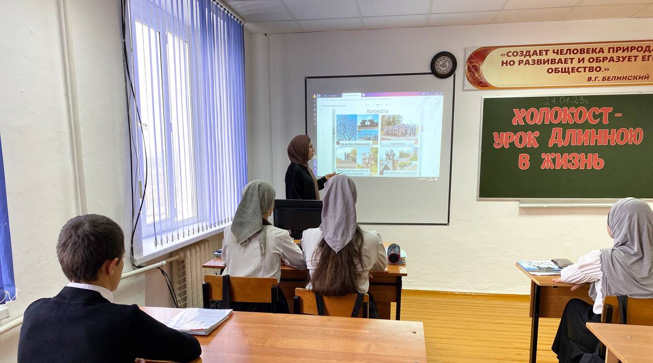 21.01.2023Сегодня учителем истории Шапиевой О.М. проведен урок памяти «Холокост-урок длинною в жизнь», посвященный освобождению Освенцима и Международному дню памяти жертв Холокоста. Обучающиеся 11, 10 и 7 класса познакомились с основными понятиями, связанными с трагедией Холокоста.