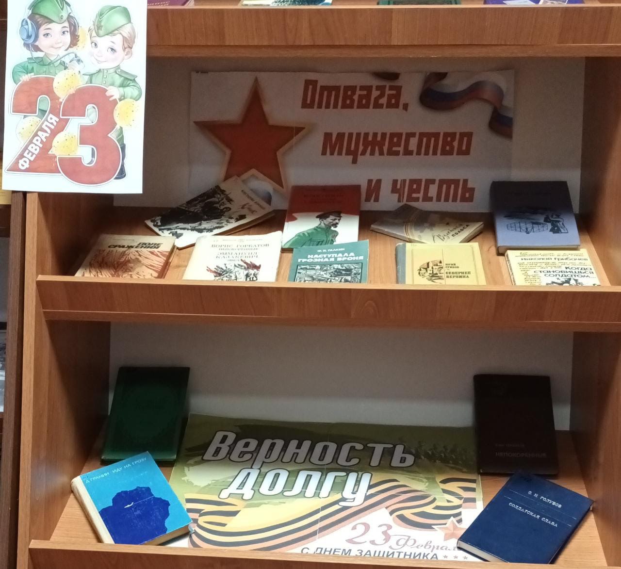 Библиотекарем школы Зуевой С.С. оформлена книжная выставка, посвященная Дню защитника Отечества « Отвага, мужество и честь»