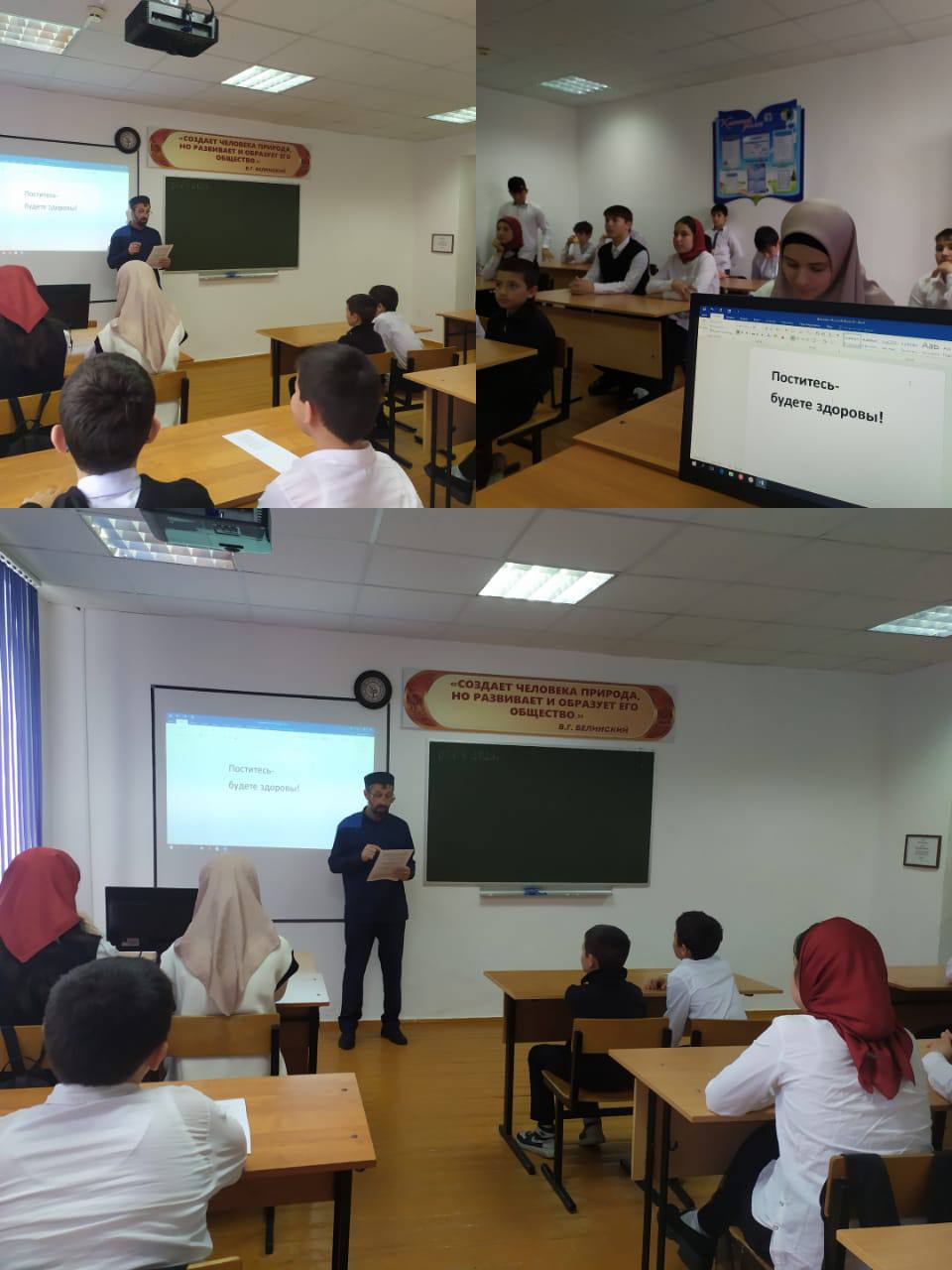 В рамках реализации единой концепции духовно-нравственного развития ЧР. Педагогом по ДНВиР Алиевим Г проведена беседа на тему: " Поститесь будете здоровыми ". Беседа приурочена ко Всемирному дню здоровья.