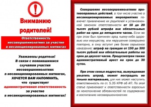 Памятка родителям «Обответственности несовершеннолетних за участие в несанкционированных публичных мероприятиях»