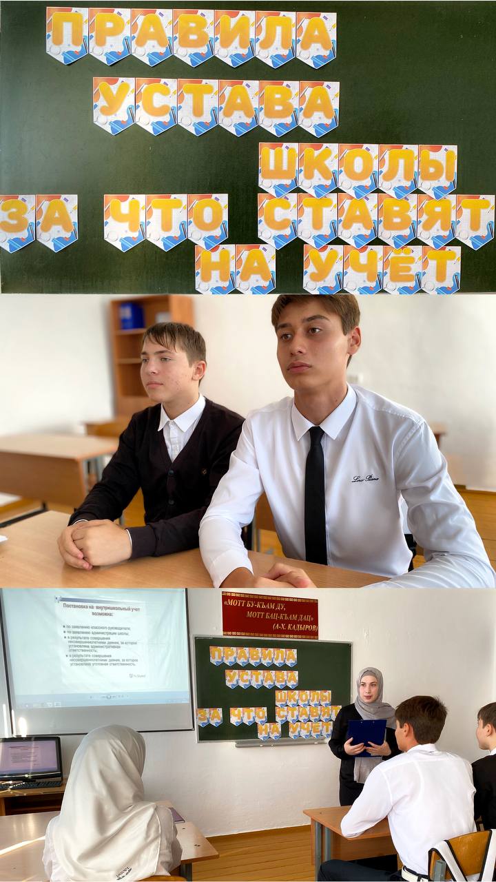 02.10.2023Информационный час «Правила Устава школы. За что ставят на внутришкольный учет?» Социальный педагог Шапиева О.М. провела беседу с обучающимися 11 класса о том, что такое внутришкольный учет и по каким причинам могут поставить на учет?