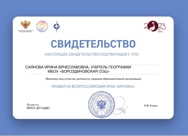 Особое внимание на данном уроке было уделено экологическим проблемам данного природного района, а именно: загрязнению бытовыми отходами прибрежных территорий, нарушением водной экосистемы при добыче нефти, истреблением морских обитателей. Ребята с интересом познакомились с материалом об Арктике, предлагали пути решения данных экологических проблем. Также ребята участвовали в интерактивной викторине «Арктика», из которой ребята узнали историю освоения Арктики. Учитель географии Саянова И.В. получила свидетельство о проведении Всероссийского урока «Арктика». #урокАрктика #ВсероссийскийурокАрктика