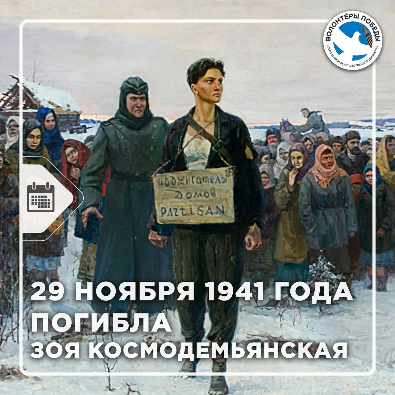 Она стала одним из символов героизма советского народа. Согласно боевому заданию, Зое нужно было сжечь 10 населённых пунктов, оккупированных немецкими захватчиками. Космодемьянская успела исполнить только часть боевого приказа, организовав поджог трёх домов в деревне Петрищево, в которых ночевали немецкие солдаты, также уничтожив их транспорт и лошадей. Во время второй попытки поджога староста деревни Семён Свиридов поднял тревогу. Зоя была схвачена и арестована, а после допроса и жутких пыток казнена через повешение. Перед казнью Героиня произнесла легендарную речь, призывая жителей села бороться с нацистами и не бояться смерти в этой борьбе: «Граждане! Вы не стойте, не смотрите, а надо помогать воевать! Эта моя смерть – это мое достижение. Товарищи, победа будет за нами. Немецкие солдаты, пока не поздно, сдавайтесь в плен! Советский Союз непобедим и не будет побежден!»Ценой своей жизни Герои ковали Победу в Великой Отечественной войне. Их подвиг не будет забыт.