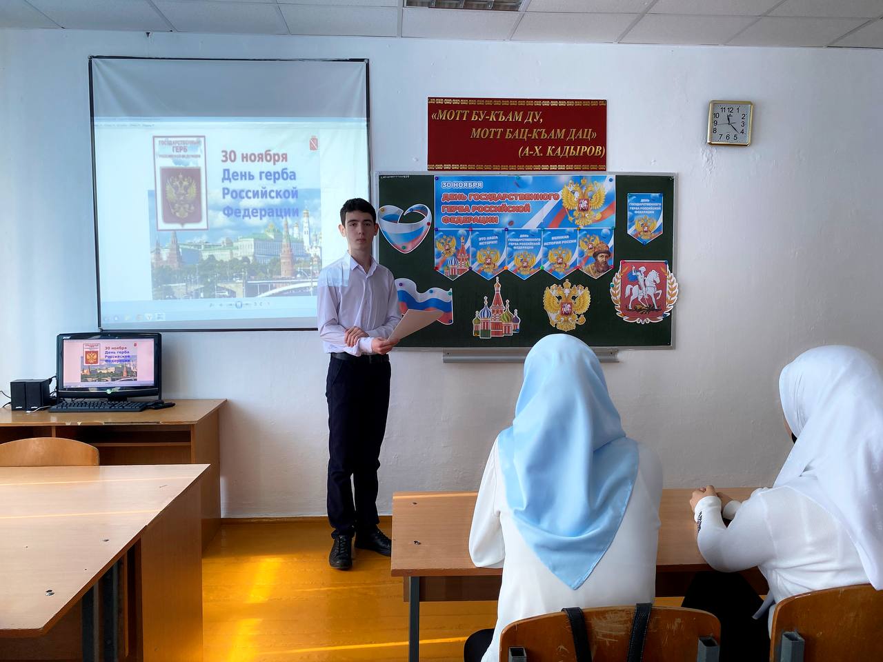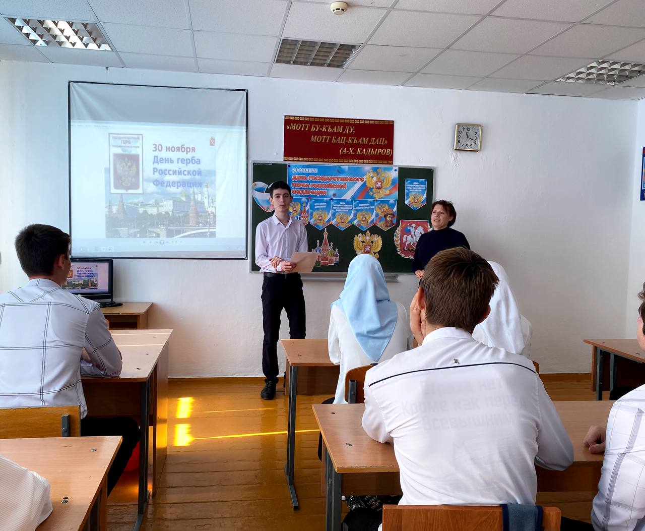 В ходе мероприятия ученики 9-11 классов познакомились с историей возникновения и развития государственной символики России с древнейших времен и до современности, отвечали на вопросы. Юнармеец Адуев Магомед рассказал о значимости и важности Герба в жизни государства и каждого гражданина.У России величавыйНа гербе орёл двуглавый,Чтоб на запад и востокОн смотреть бы сразу мог.Сильный, мудрый он и гордый.Он – России дух свободный.