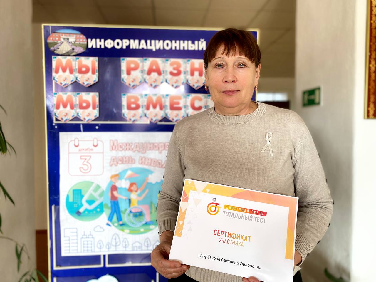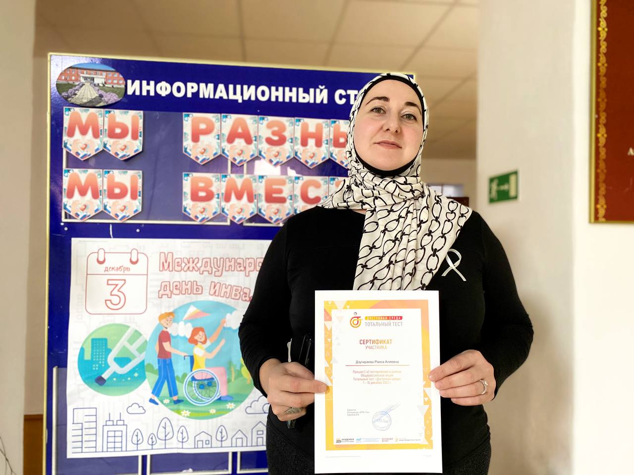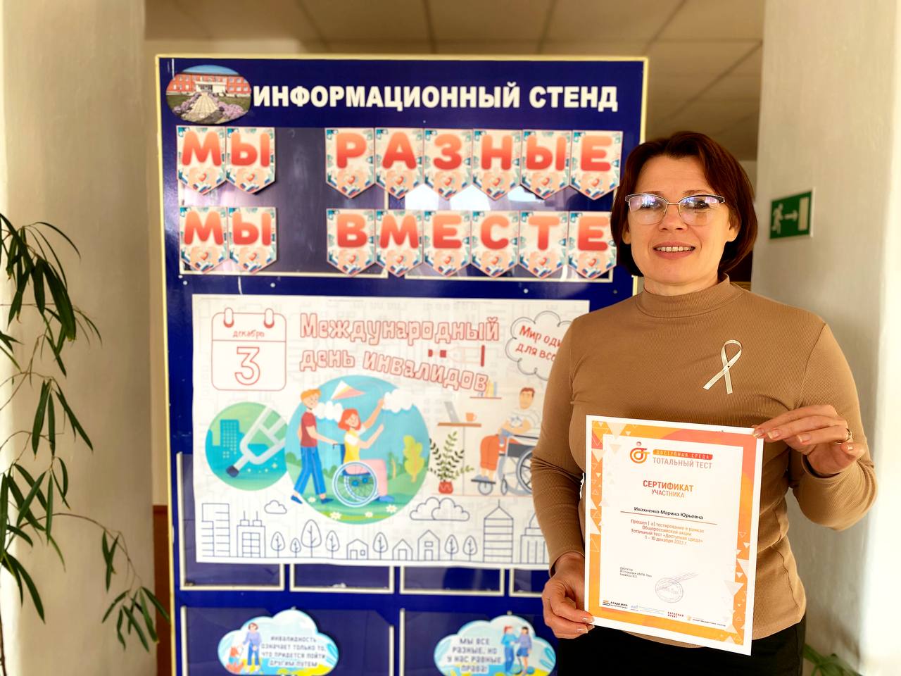 В ходе тестирования каждый проверил свои знания на тему организации безбарьерного пространства и общения с людьми с инвалидностью. Ключевые тематические блоки теста: комплексный подход в организации доступной среды, морально-этические аспекты общения с людьми с инвалидностью, оказание ситуационной помощи при сопровождении людей с нарушениями слуха, зрения, опорно-двигательного аппарата, ментальными нарушениями. По итогам тестирования учителя получили сертификаты участников.