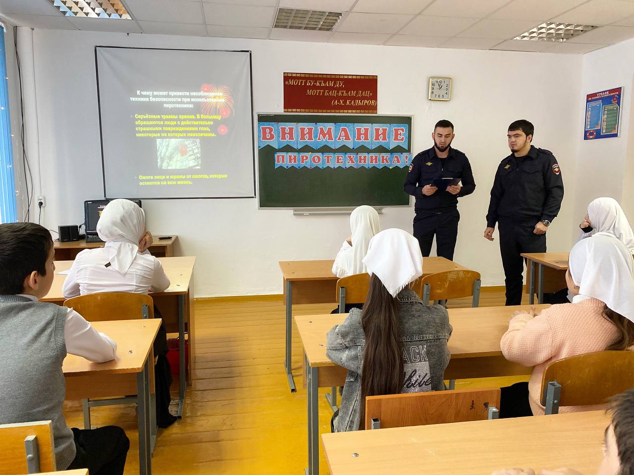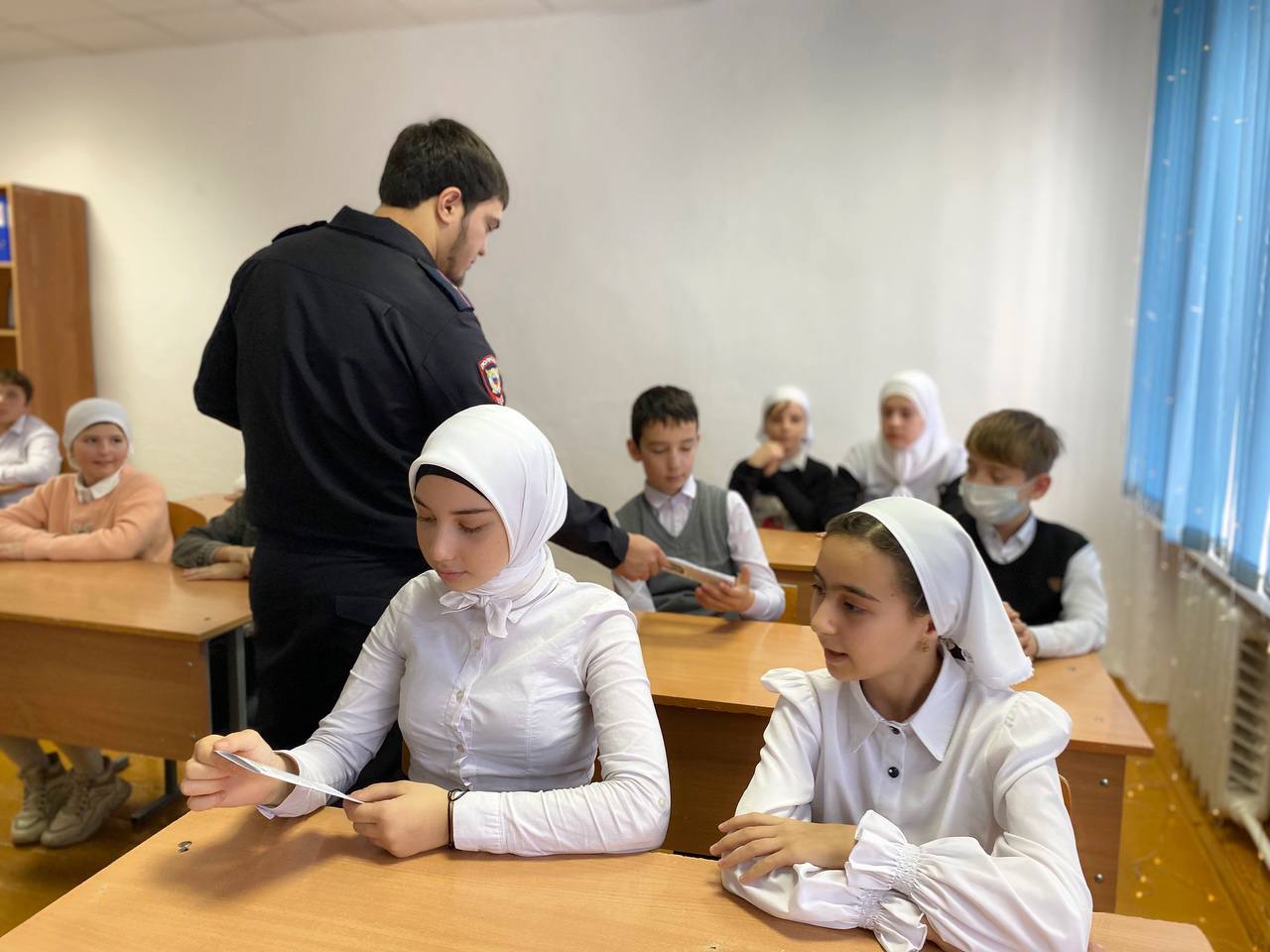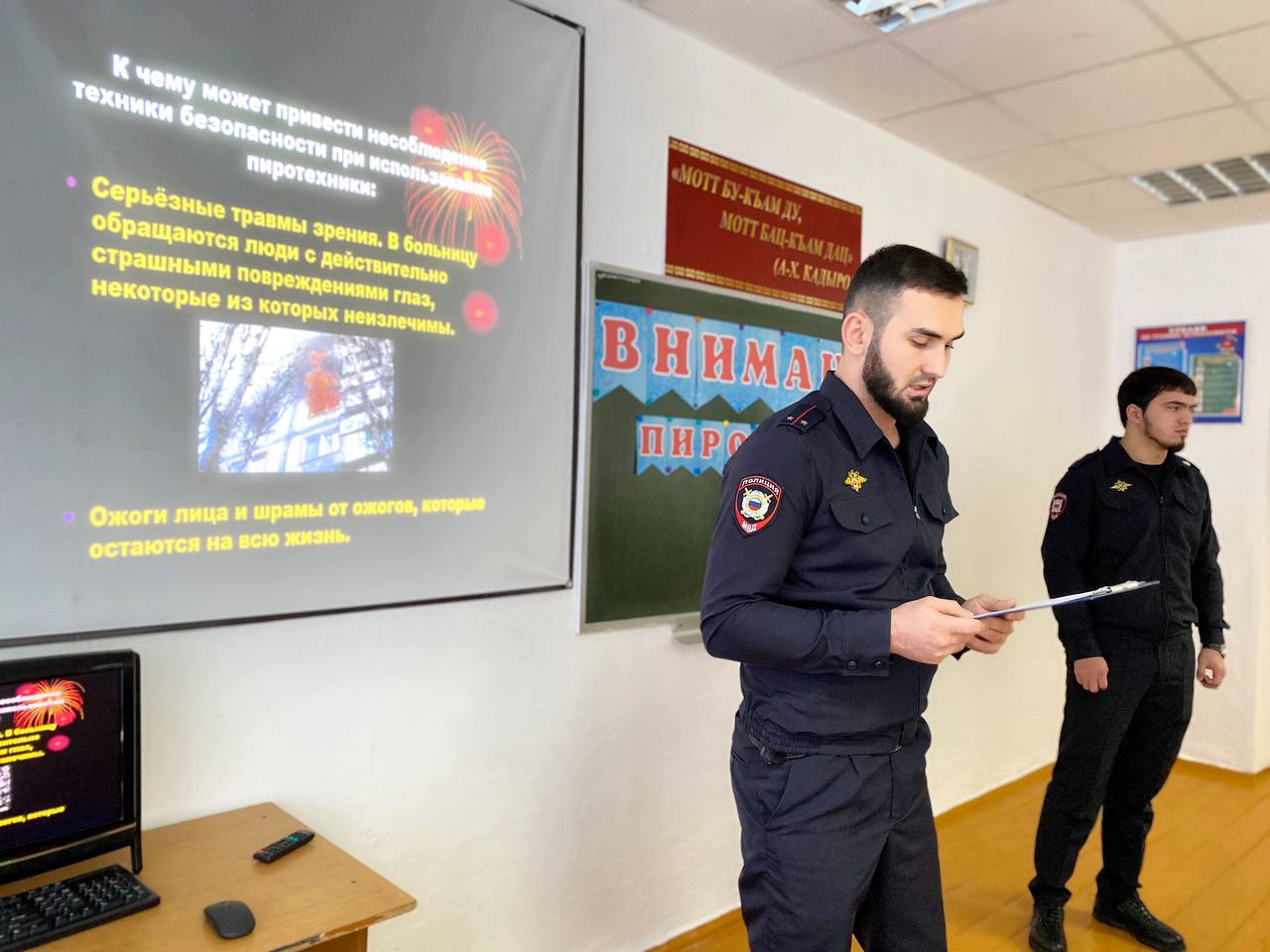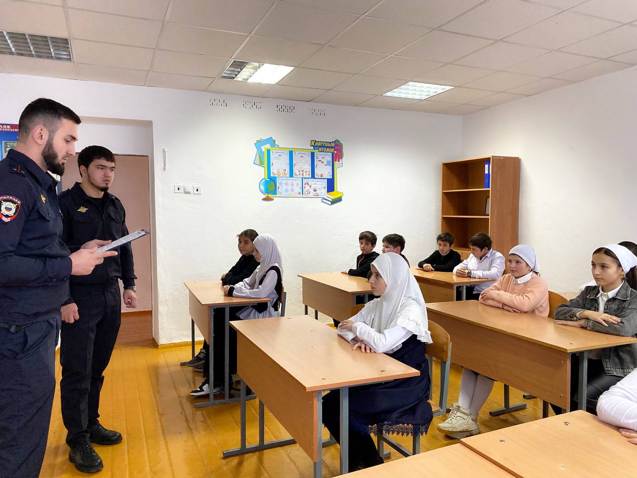 25.12.2023В рамках общественной безопасности инспектор по делам несовершеннолетних Отдела МВД России по Шелковскому району Муташев Билал в преддверии зимних каникул и новогодних праздников, провел профилактическую и воспитательную беседу в МБОУ «Бороздиновская СОШ» с учащимися 6-7 классов.