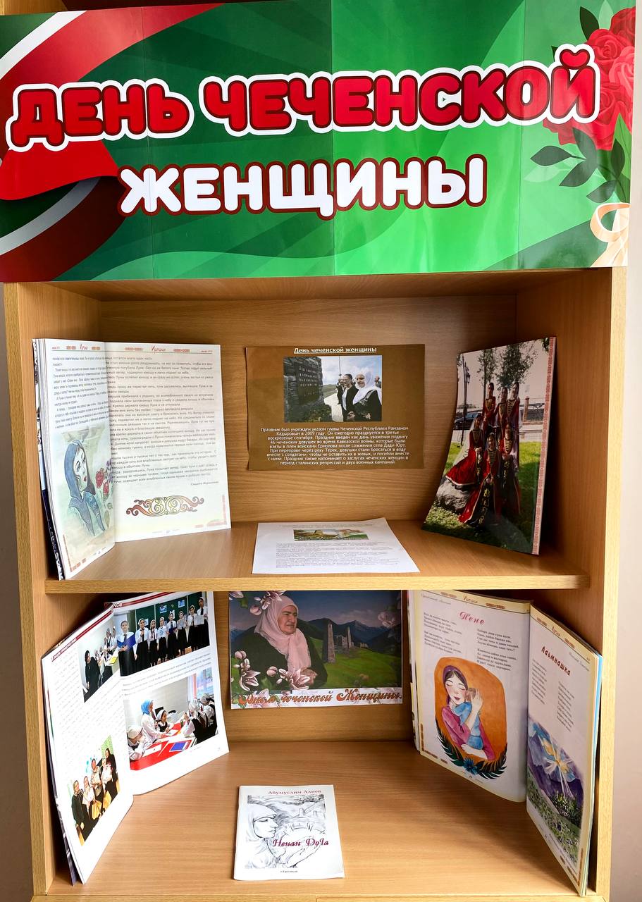 Чеченская женщина, ты - воплощение смирения, нежности и доброты! Хава Бекмурзаевна Магамадова Библиотекарем Зуевой С.С. оформлена информационно-иллюстрированная книжная выставка «Образ чеченской женщины в литературных произведениях».