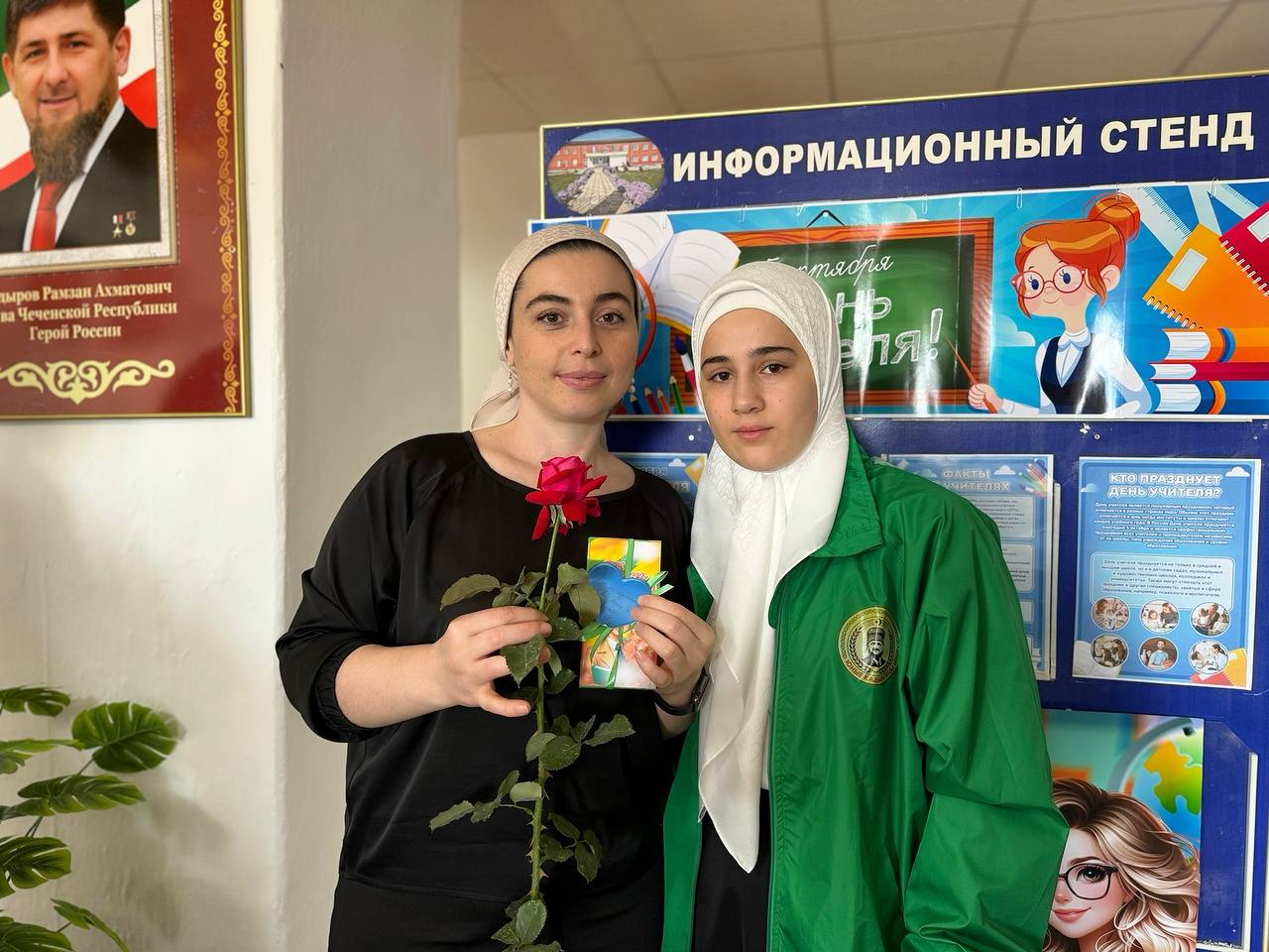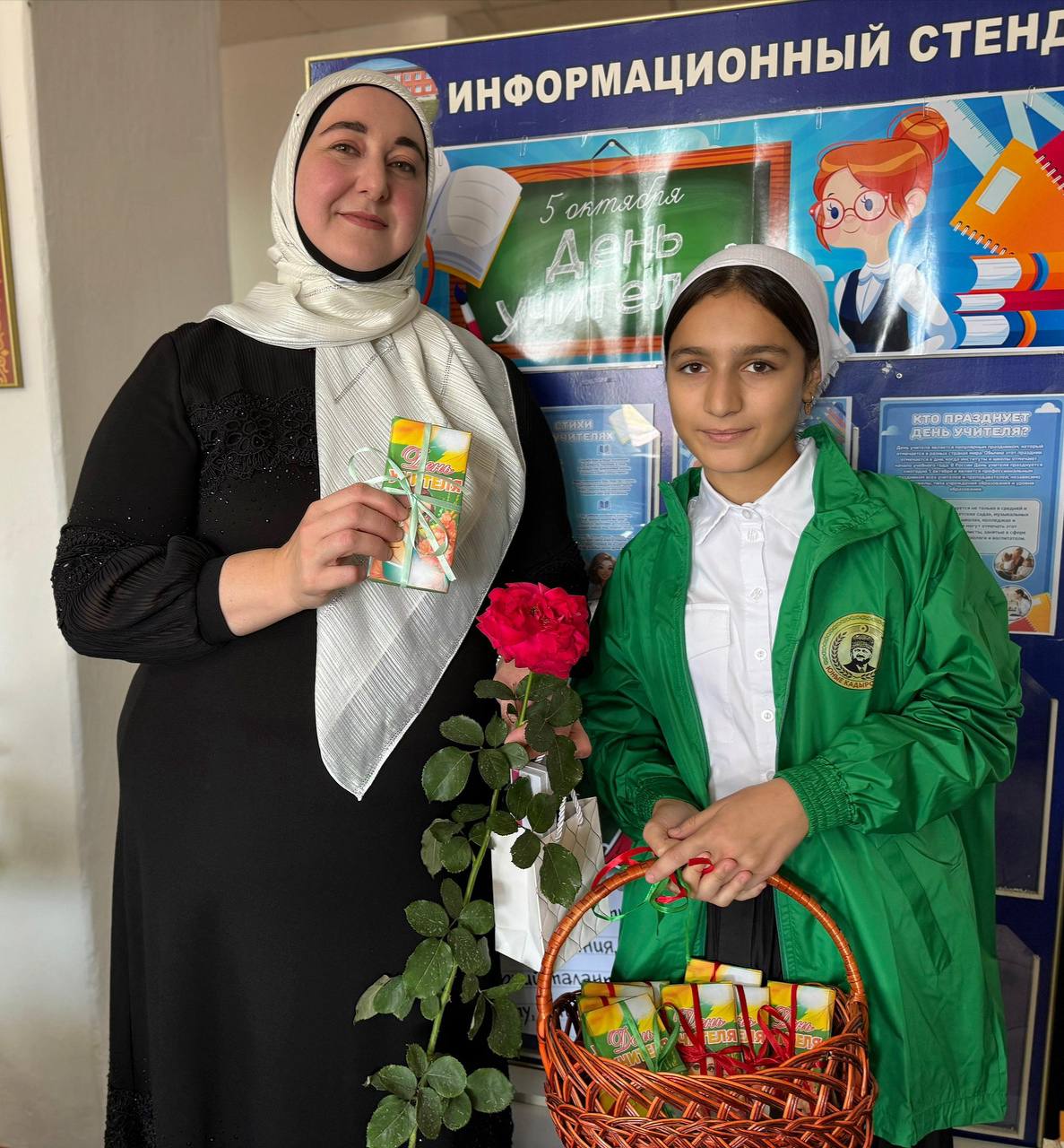 Заместитель директора по воспитательной работе Шапиева Оксана Муртазалиевна вместе с активистами ЕДЮО «Юные Кадыровцы» и волонтерского движения «Доброе сердце» провели акцию по раздаче небольших открыток и шоколадок с поздравлениями ко Дню Учителя.  Благодаря этой инициативе дети смогли порадовать своих любимых учителей школы и подарить им улыбку в этот особенный день!