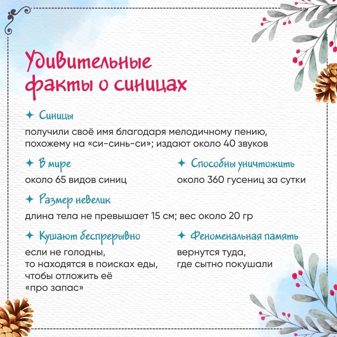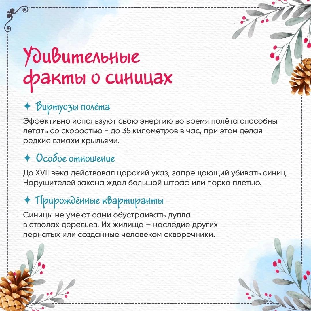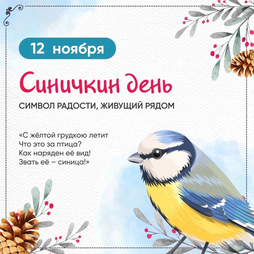 12.11.2024Друзья, сегодня, 12 ноября, мы отмечаем Синичкин день! Этот праздник посвящён нашим ярким пернатым друзьям – синичкам. Приготовили для вас подборку интересных фактов об этих удивительных птицах. Листайте карточки и узнавайте больше! Поделитесь своими фотографиями синичек и расскажите, как вы заботитесь о птицах зимой.