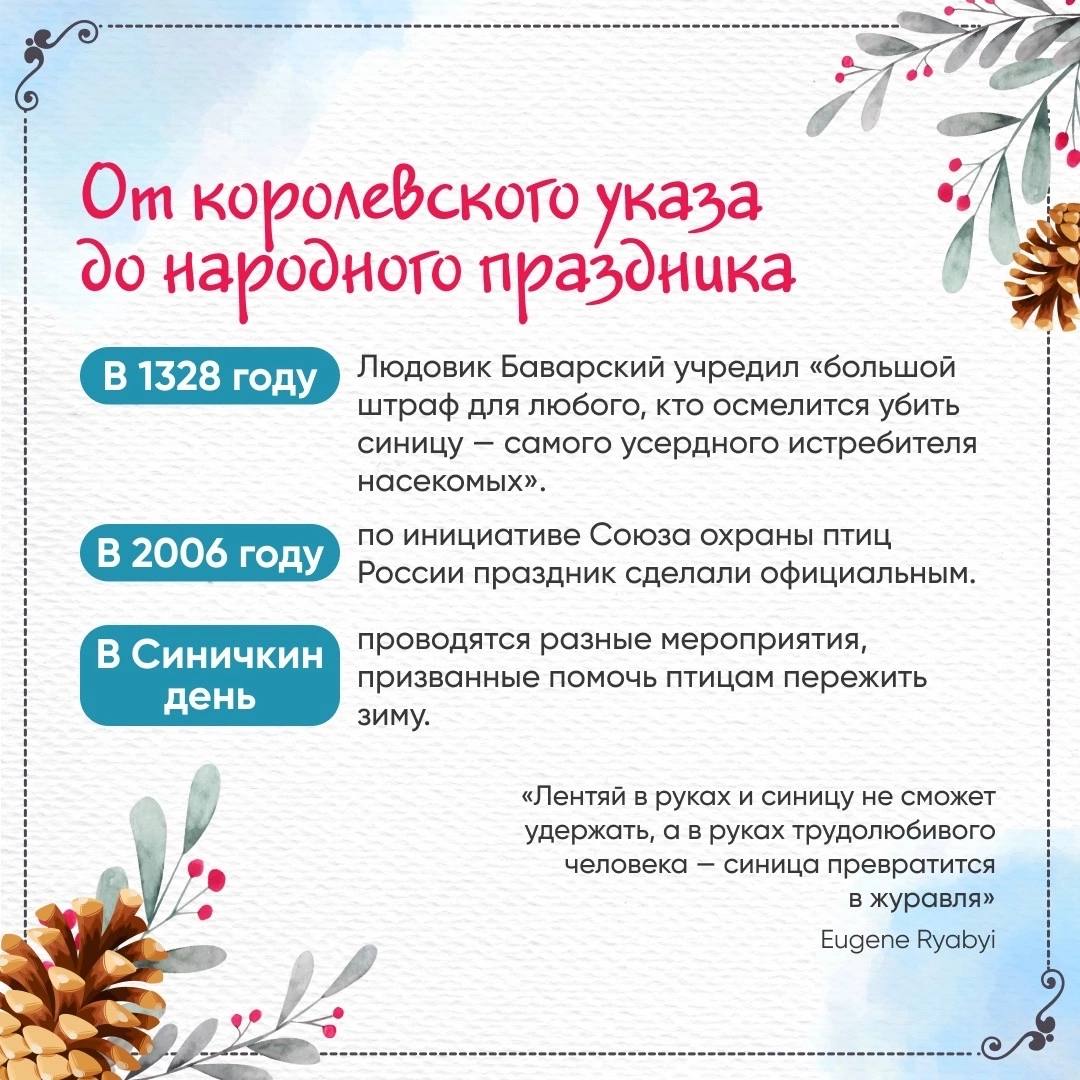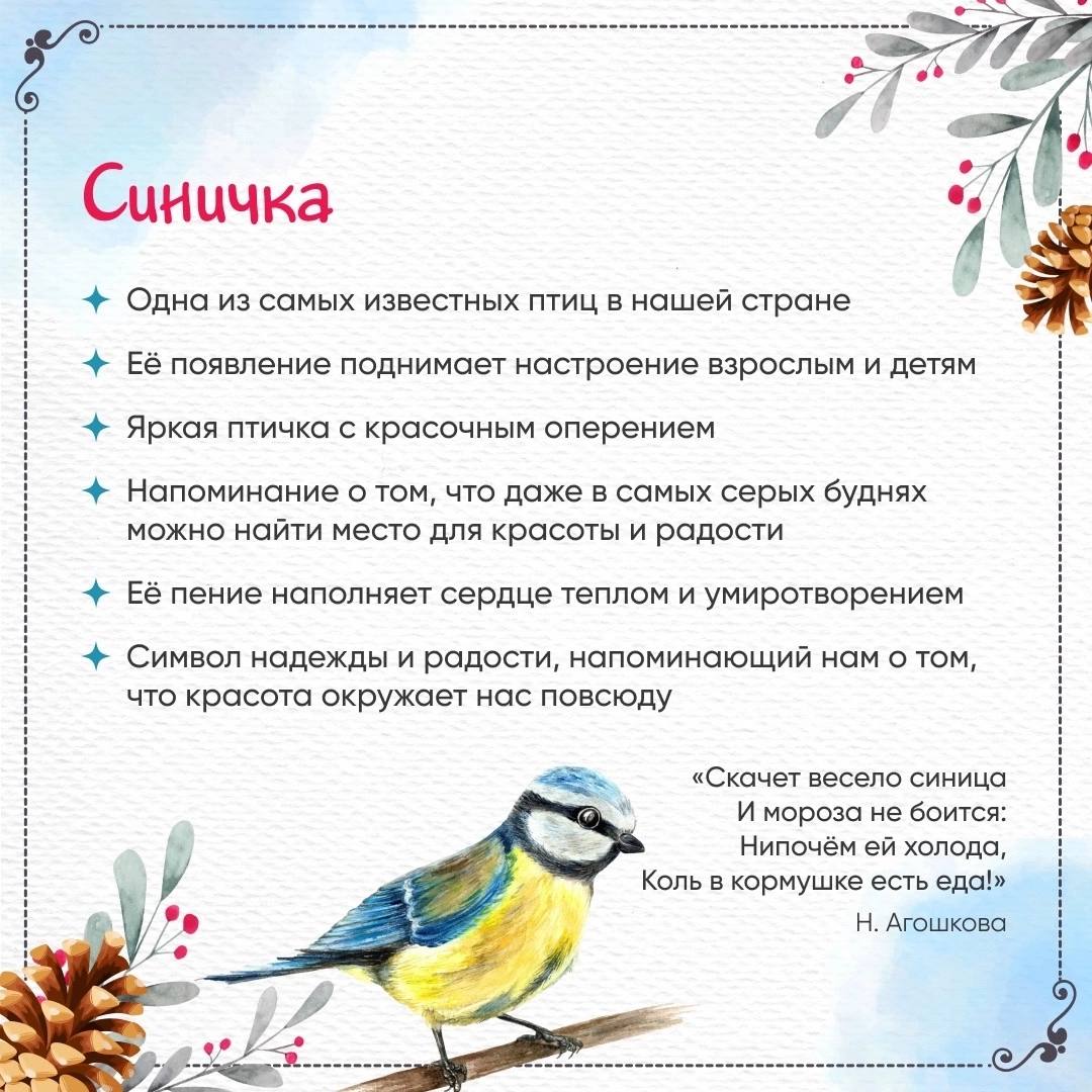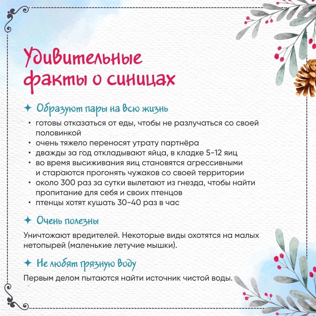 12.11.2024Друзья, сегодня, 12 ноября, мы отмечаем Синичкин день! Этот праздник посвящён нашим ярким пернатым друзьям – синичкам. Приготовили для вас подборку интересных фактов об этих удивительных птицах. Листайте карточки и узнавайте больше! Поделитесь своими фотографиями синичек и расскажите, как вы заботитесь о птицах зимой.