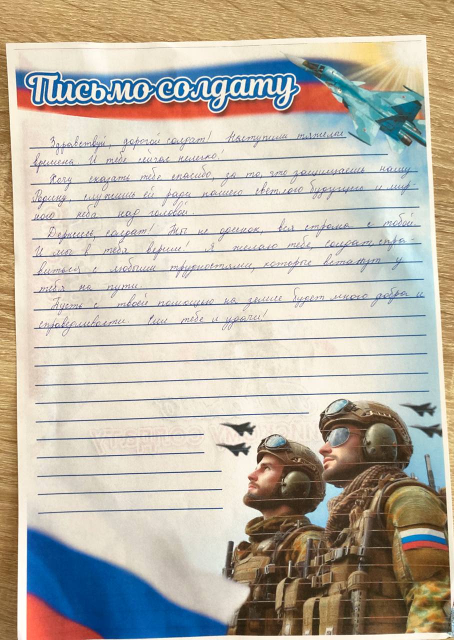 Весточка из дома была радостным событием, которое придавало сил солдатам, поднимало их боевой дух. Писали не только родные и близкие, но и совершенно незнакомые. Чтобы поддержать защитников Отечества в наши дни, обучающиеся 10 и 11 классов МБОУ «Бороздиновская СОШ тоже написали письма с добрыми пожеланиям бойцам Дорогой солдат! Ты не одинок, вся страна с тобой. И мы в тебя верим! Своих Не Бросаем Zа ПОБЕДУ
