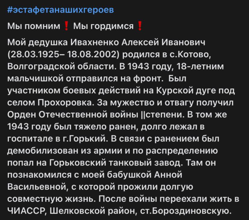 09.12.2024В школе с 01 по 12 декабря 2024 года проходит эстафета героев, посвящённая Дню Героев Отечества Обучающиеся, педагоги, родители (законные представители) на личных страницах размещают фото героя с кратким описанием подвига с использованием хештега #эстафетанашихгероев! Примем активное участие в эстафете!