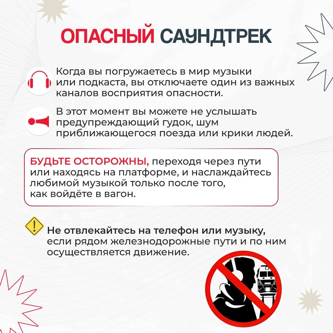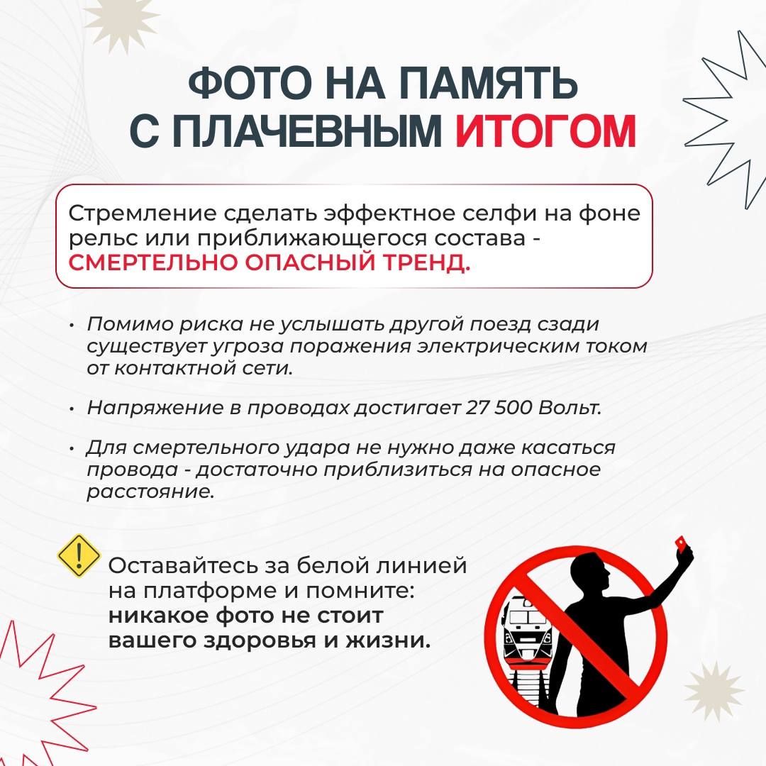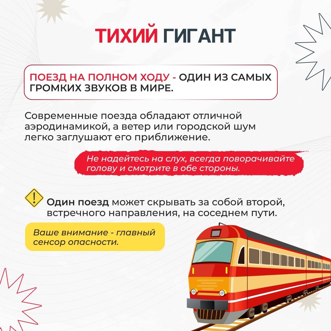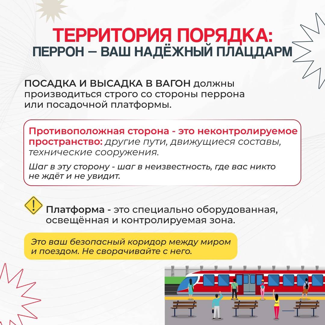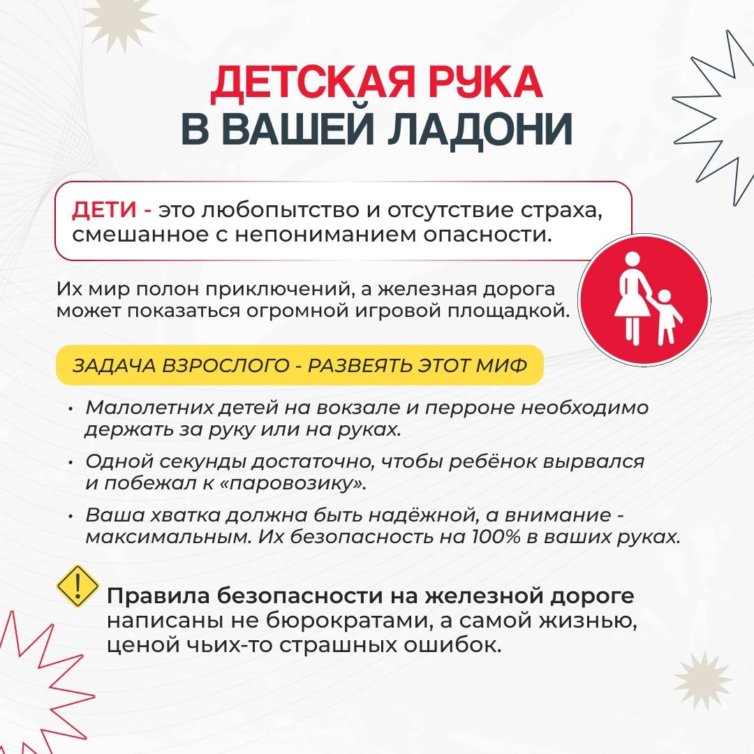 На железной дороге ЗАПРЕЩЕНОоставлять детей без присмотра – это может привести к трагическим последствиям. Всегда помните, что находясь на железнодорожных объектах, детей необходимо держать за руку или на руках. Железная дорога не место для игр, а зона повышенной опасности! Каждый год происходят несчастные случаи, которые можно предотвратить, если соблюдать простые правила. Объясните детям, что переходить железнодорожные пути можно только в установленном месте и только после того, как убедились, что нет приближающегося поезда. Напомните, что на платформе нельзя бегать и играть. Безопасное расстояние от края платформы — это залог безопасности! Убедитесь, что ваши дети знают, как правильно вести себя в случае экстренной ситуации: оставаться спокойными и следовать указаниям работников железной дороги. Не забывайте о правилах безопасности в общественном транспорте: держитесь за поручни, не высовывайтесь из окон и не отвлекайтесь на телефоны и гаджеты. Давайте вместе заботиться о безопасности наших детей! #БезопасностьНаЖД #ЖелезнаяДорога #ДетиНаЖД #ПравилаПоведения #Безопасность#Уступидорогупоездам