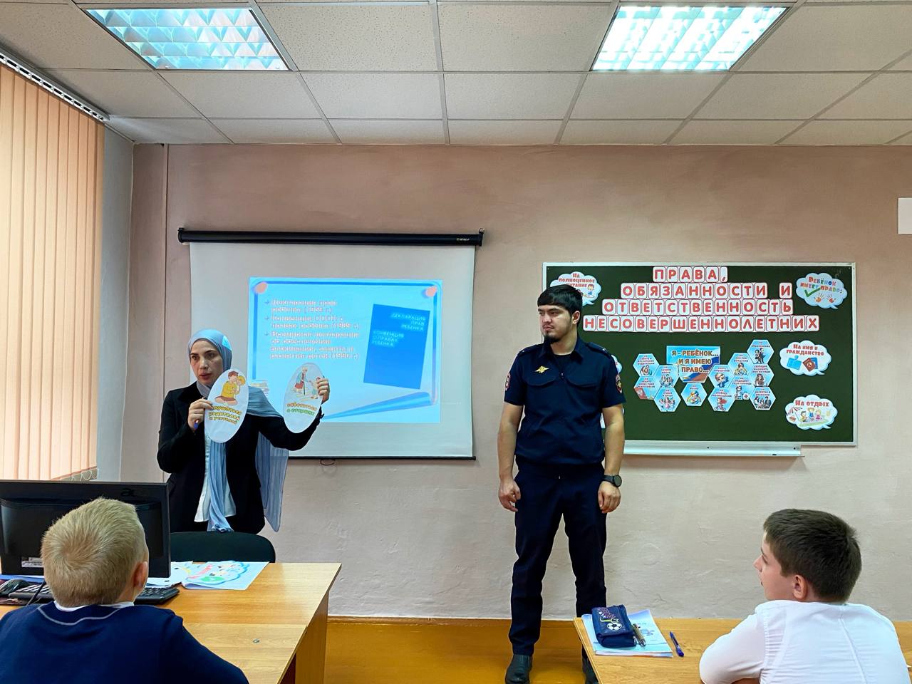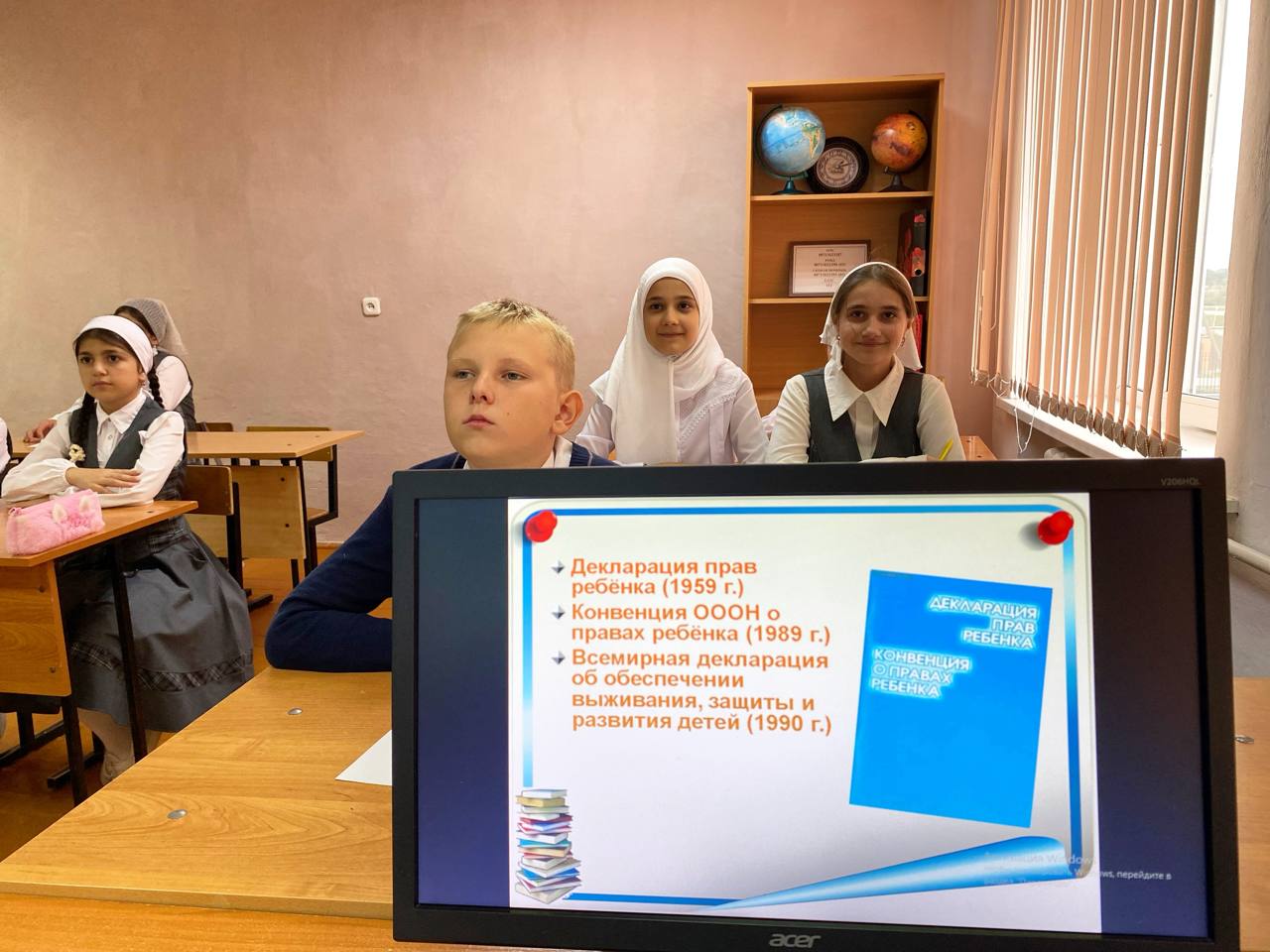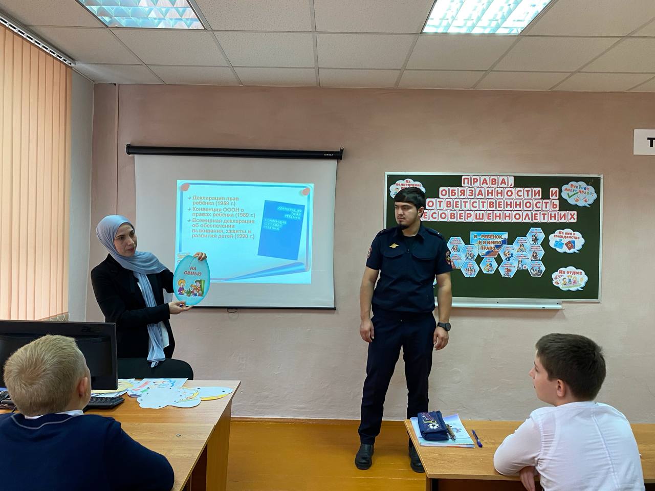 В начале встречи ребята узнали о важных международных документах, таких как Всеобщая декларация прав человека и Конвенция о правах ребёнка. В этих документах закреплены основные права и обязанности каждого человека. Социальный педагог Шапиева О.М. подробно рассказала учащимся об их основных правах, среди которых:- право на семью;- право на заботу и защиту со стороны государства в случае отсутствия временной или постоянной защиты со стороны родителей;- право посещать школу и получать образование;- право на равенство и недискриминацию;- право свободно выражать свои мысли и мнения;- право на собственное мнение и участие в принятии решений, касающихся их жизни;- право на имя и гражданство;- право на получение информации, необходимой для их развития и воспитания;- право на защиту от насилия и жестокого обращения;- право на медицинское обслуживание и поддержку здоровья.В заключение беседы инспектор ПДН Билал Юнусович отметил важность осознания своих прав и обязанностей, а также ответственности за свои поступки. Ребята активно задавали вопросы, делились своими взглядами и пониманием тематики. Это стало хорошей основой для дальнейших обсуждений и углубленного изучения правовой темы.