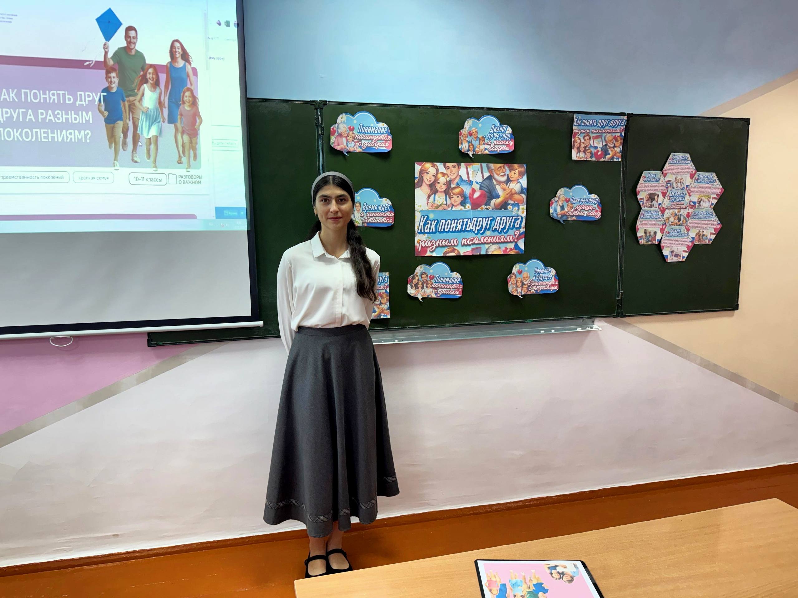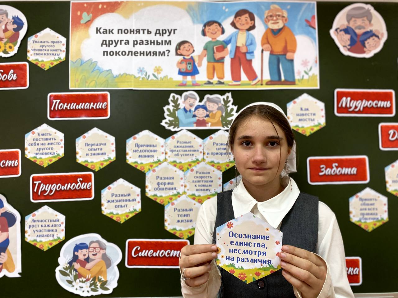 Каждый класс, в соответствии со своим возрастом, искал ответ на вопрос: «Как понять друг друга разным поколениям?» 1-2 классы: Говорили добрые слова и создавали «волшебные» сердца. 3-4 классы: Разгадывали ребусы и узнали, что такое взаимопонимание. 5-7 классы: Строили «мосты» и изучали свою «Карту поколений». 8-9 классы: Осваивали технику «Я-высказываний» и учились вести конструктивный диалог. 10-11 классы: Разбирались в «искусстве общения» и своей роли в цепи поколений.Было искренне, мудро и по-семейному тепло! Спасибо всем ребятам и учителям за этот диалог!
