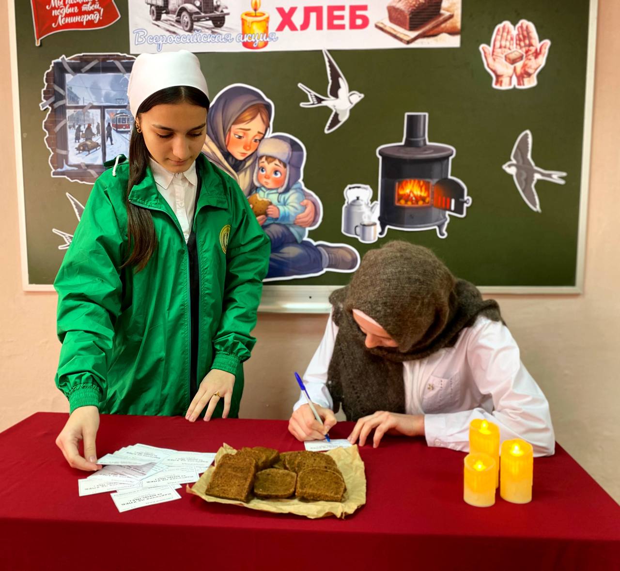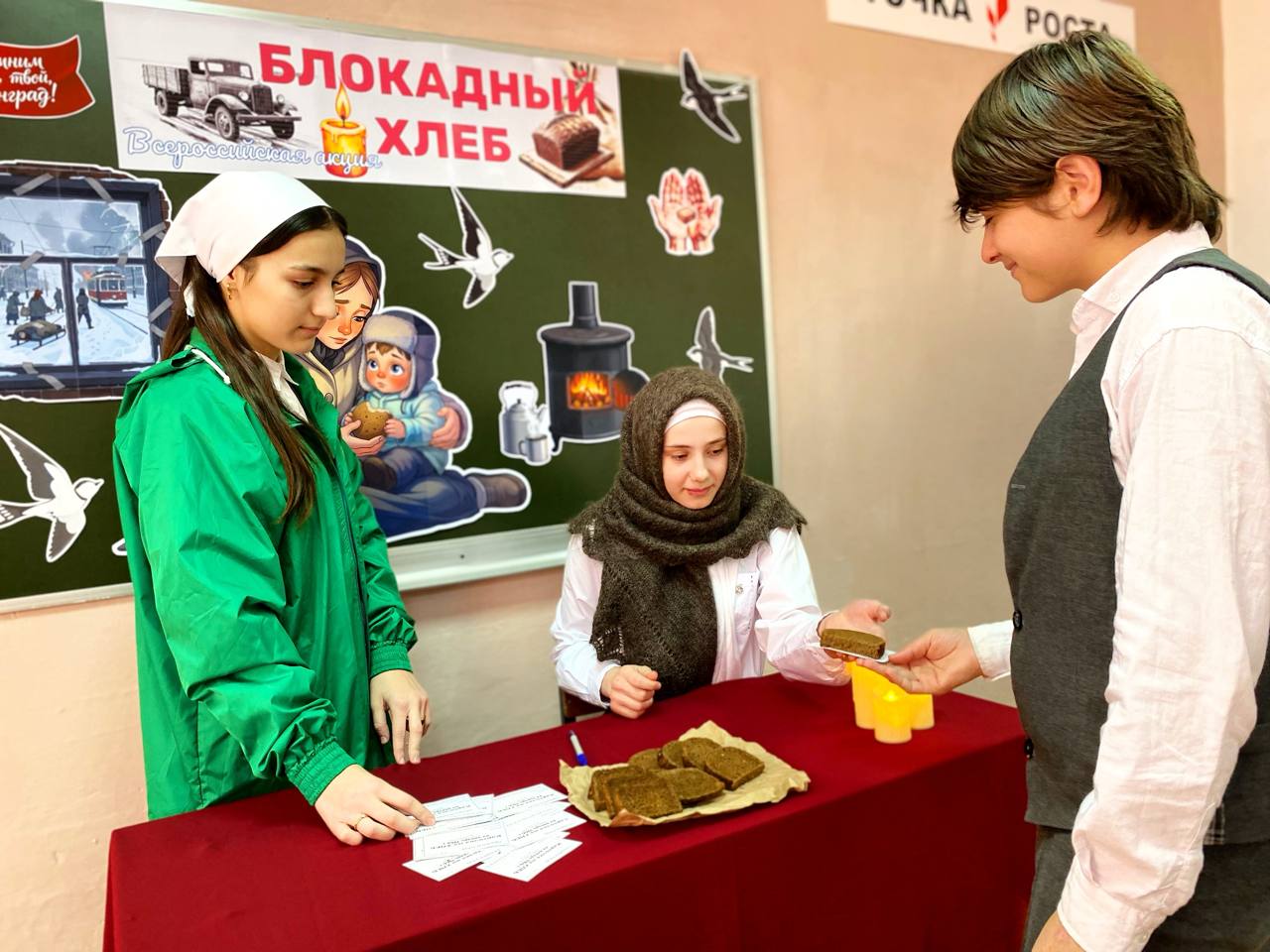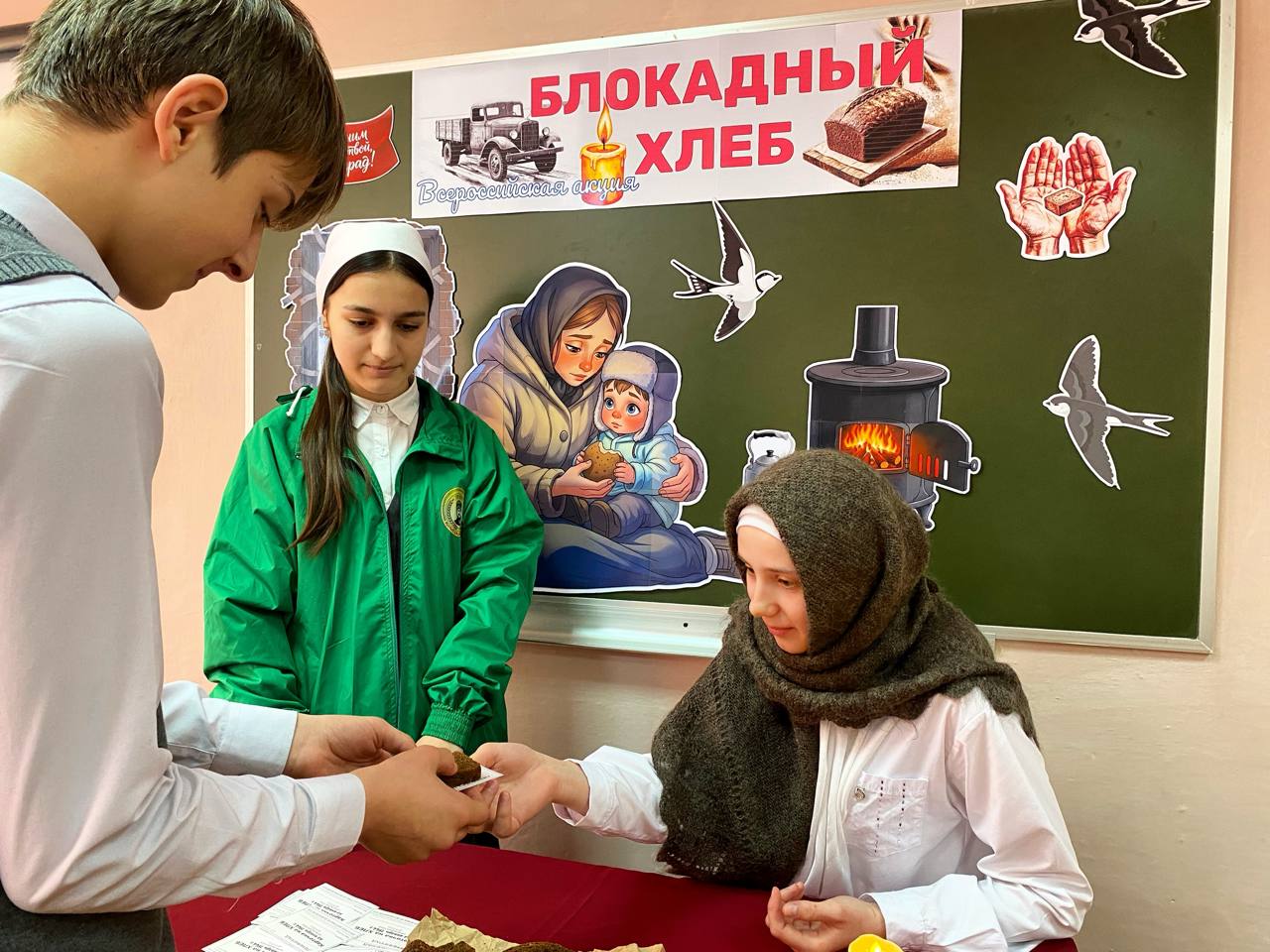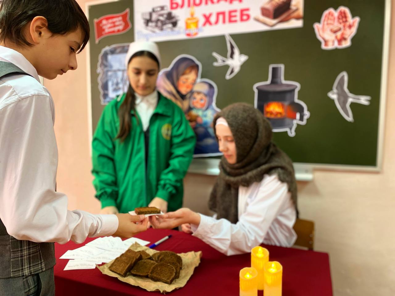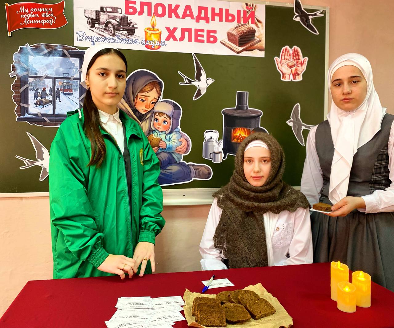 Единственной надеждой на завтрашний день был паек. Буханка хлеба постепенно превратилась в 125-граммовый кусочек — именно такой была минимальная норма выдачи хлеба для жителей блокадного Ленинграда. Этот символ мужества и выживания напоминает нам о том, как важен каждый кусочек хлеба. Сегодня активисты ЕДЮО «Юные Кадыровцы» и волонтёры провели акцию «Блокадный хлеб». В ходе мероприятия педагогам и обучающимся раздавали информационные листовки о блокаде Ленинграда во время Великой Отечественной войны, а также кусочки хлеба весом 125 грамм, что дало возможность всем участникам почувствовать связь с историей и осознать ценность жизни и свободы.